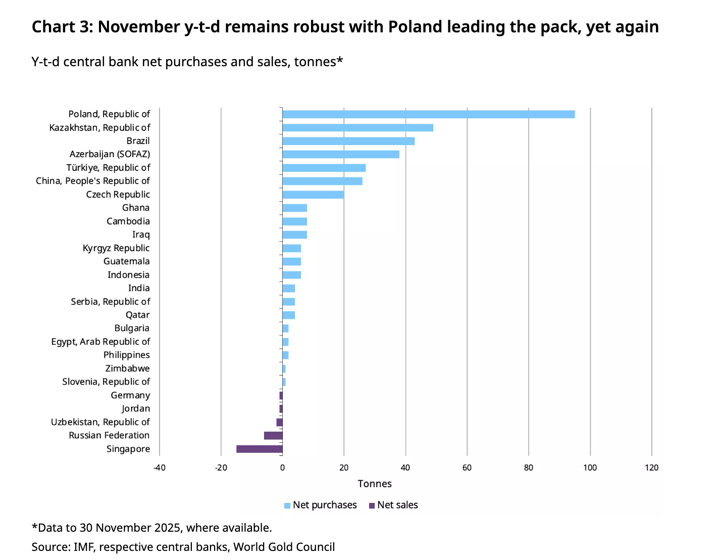 The National Bank of Poland was again the largest buyer in November, buying 12 tons of gold. This brings Poland's gold reserves to 543 tons, accounting for almost 28 percent of the country's total international reserves. Poland is by far the largest buyer this year, with a total of 95 tons.