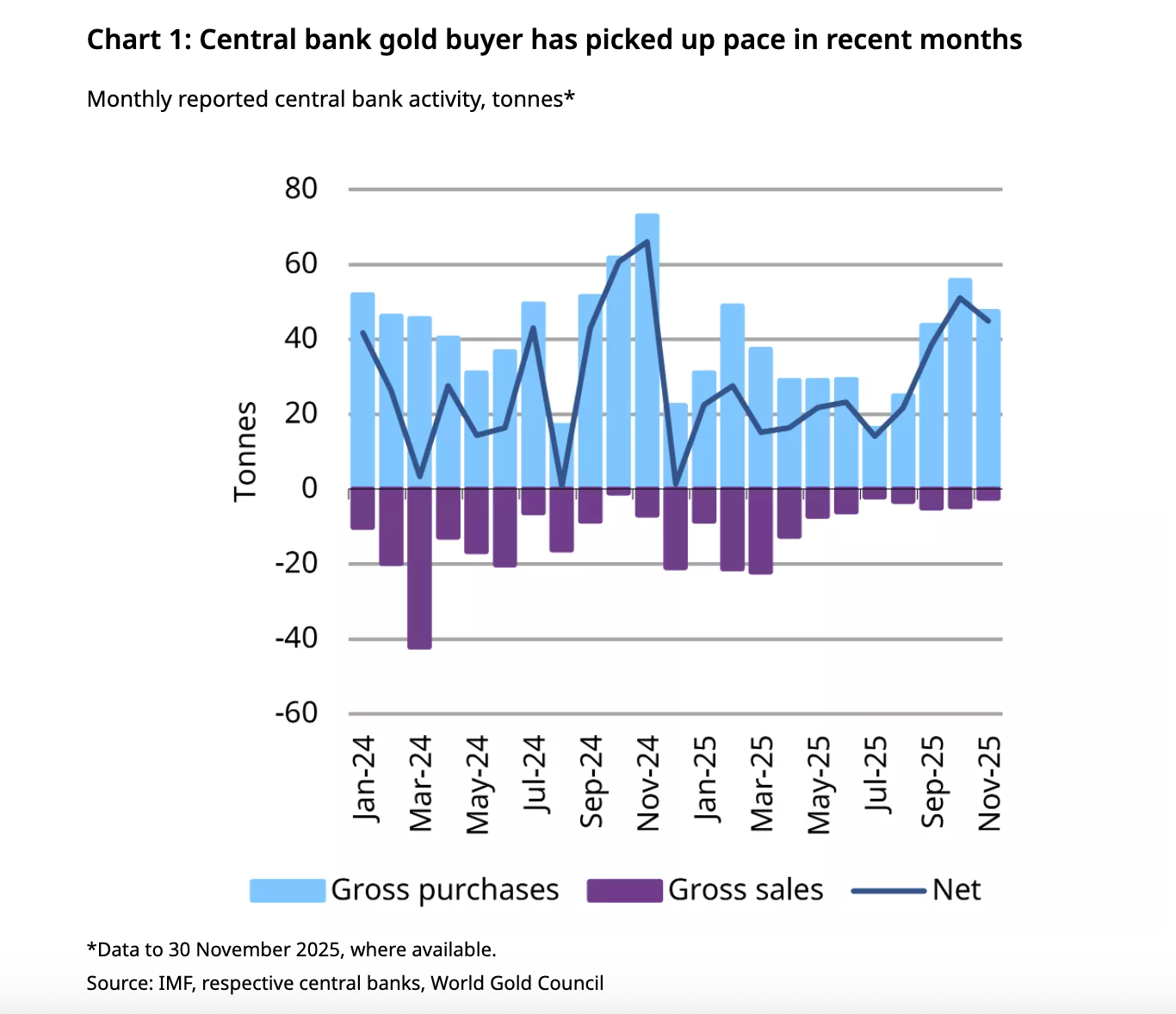 In November, central banks purchased around 45 tons of gold, while annual gold production in 2022 was around 3,500 tons. With those 45 tons, central banks bought around 15 percent of the total monthly output in November 2025, provided that production reaches the same level for that year.