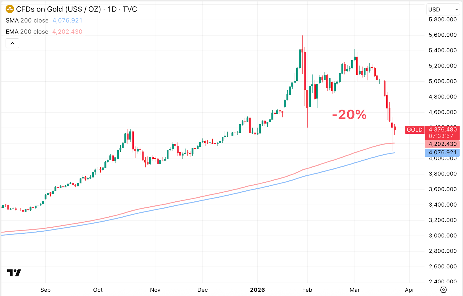 Gold prices are falling more than 20% from all-time high and are officially in a bear market. Source: TradingView