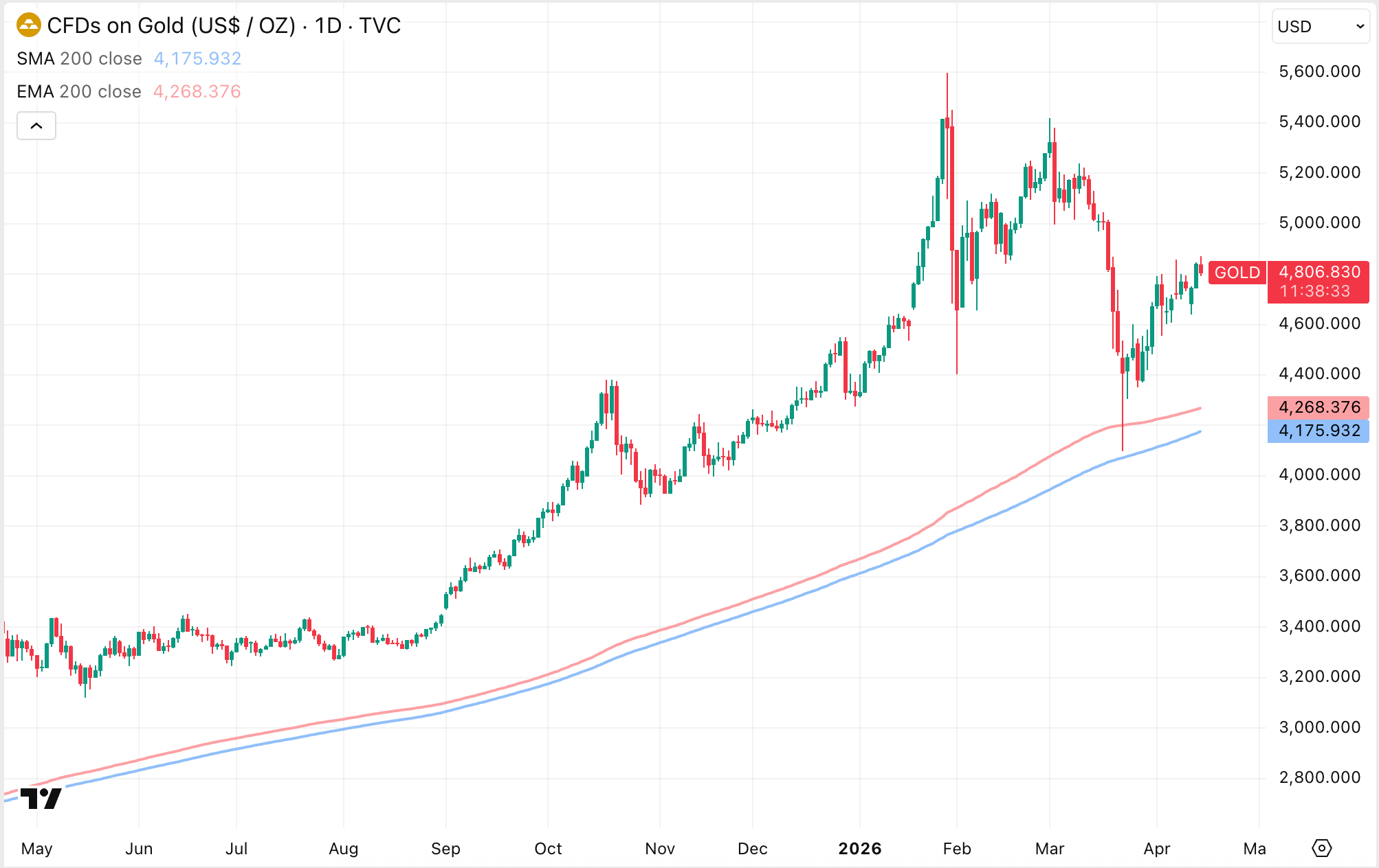 In addition, the 200-day price average (blue) and the 200-day exponential price average (red) strongly supported the gold price in March.