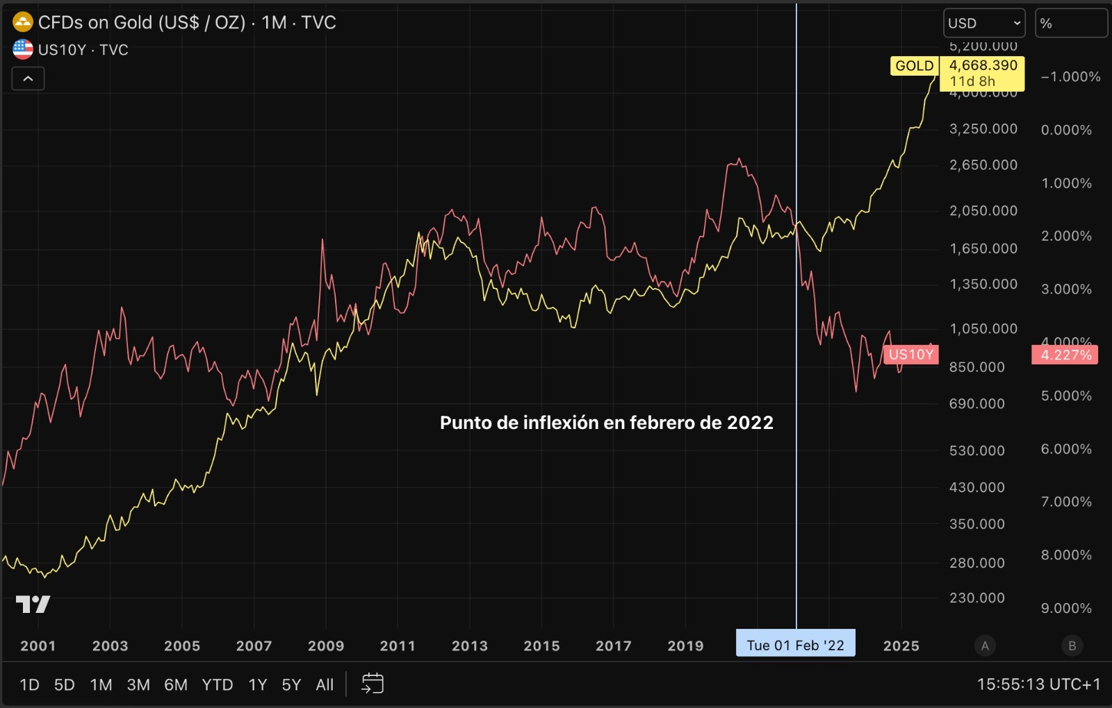 Eso cambió en febrero de 2022, después de que el ejército ruso invadiera Ucrania y Occidente decidiera congelar las reservas de dólares de Rusia. Desde entonces, la tasa de interés de los préstamos estadounidenses a 10 años ha subido enormemente, pero rompió la relación inversa con el oro y el metal precioso también comenzó a subir de forma explosiva.
